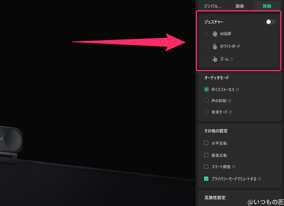 ただし、「Insta360 Link Controller」のジェスチャー機能をあらかじめONにしておく必要があります。