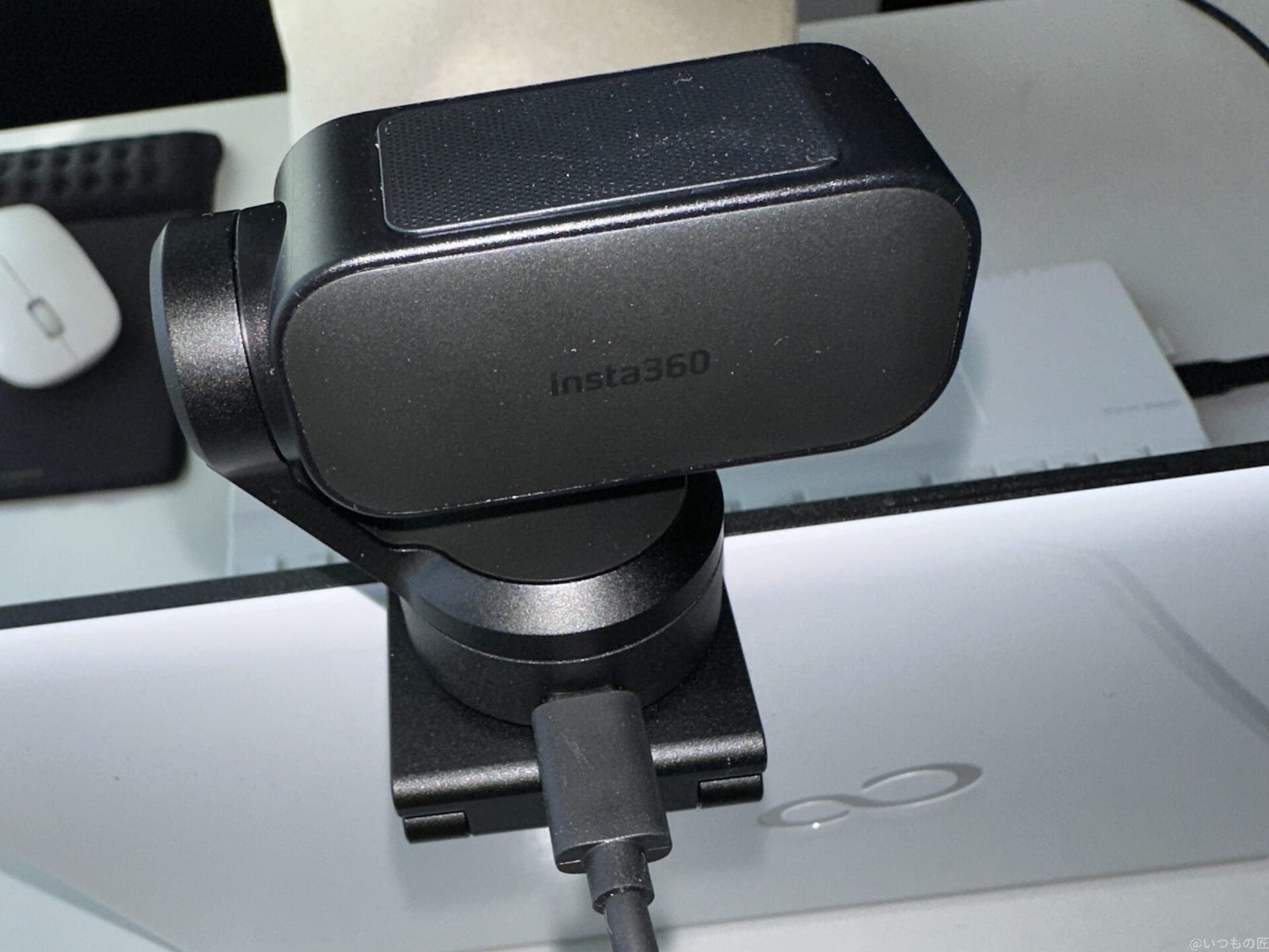 Insta360 Link 2はジンバル搭載モデルのため、やや重めではありますが、その分しっかりとした作りで安心感があります。下部はマグネット式で、金属製の棚やモニターアームなど、ケーブルが届く場所であれば気軽に取り付けられます。