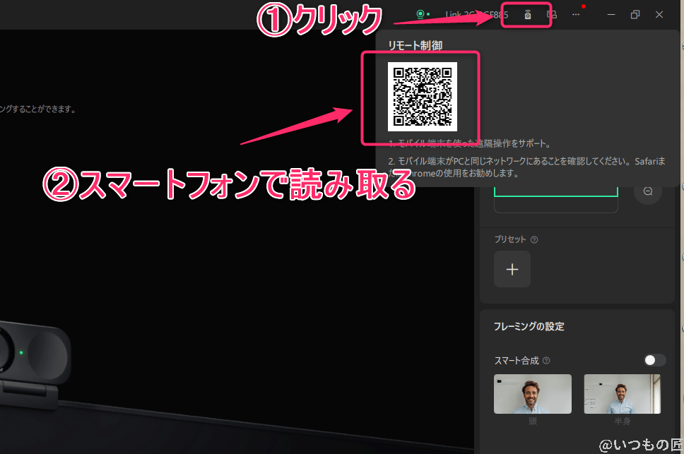 さらに、スマートフォンとの連携も可能です。バーコードを読み取るだけで簡単に接続でき、カメラの向きやズーム、各種設定を手動で遠隔操作できます。