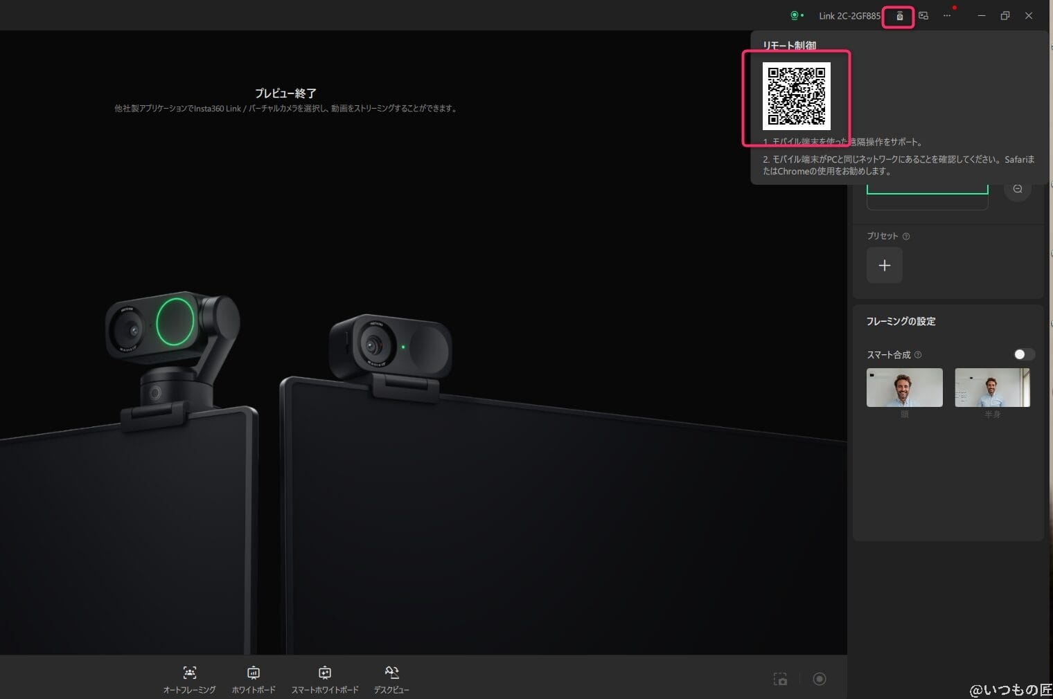 ①「Insta360 Link controller」から「リモート遠隔」をクリックする。スマートフォンでバーコードを読み取り連携する。