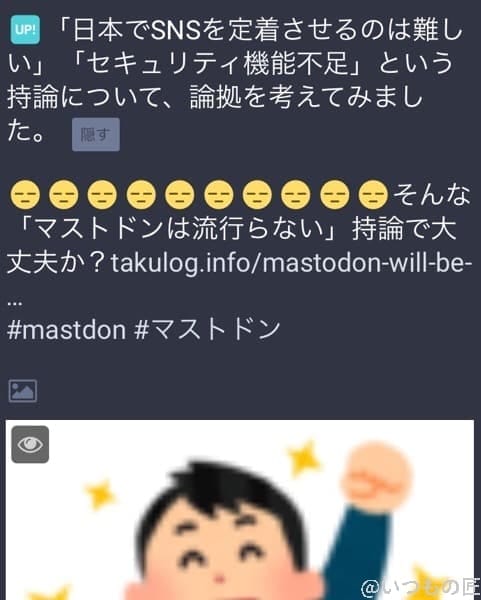 匠の素のトゥートなんかでは、たまに「絵文字が目障りだ」というキビしいコメントをいただくこともあります。そこで、こういう風に隠したトゥートにしてみた方が目障りではないのかもしれませんね。
