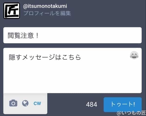 トゥートの入力画面にて、画像のように「CW」ボタンを選択します。